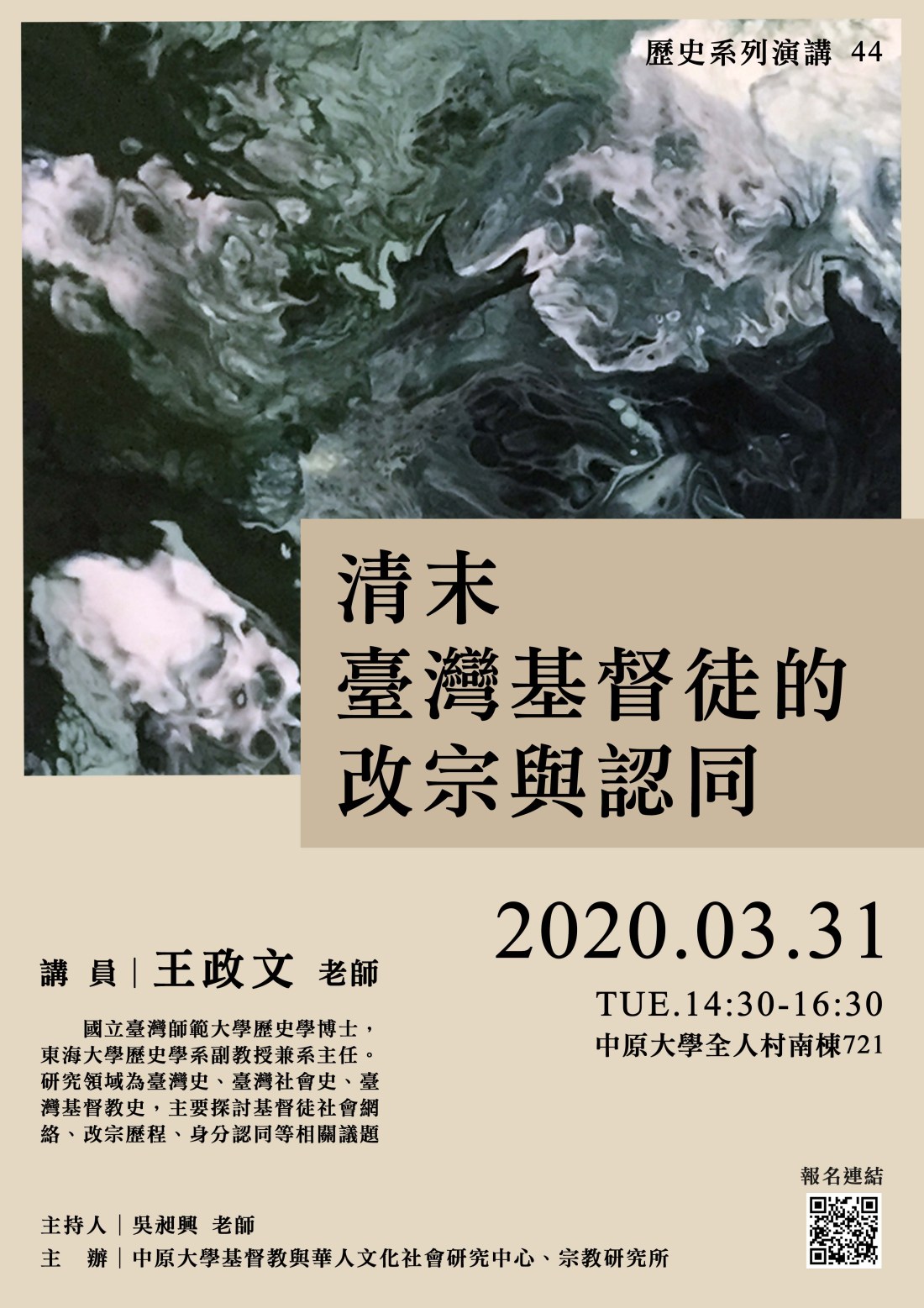 東海大學歷史學系主任王政文老師將於3月31日蒞臨本中心,帶來【清末臺灣基督徒的改宗與認同】演講,歡迎大家踴躍參 … 繼續閱讀 演講【清末臺灣基督徒的改宗與認同】