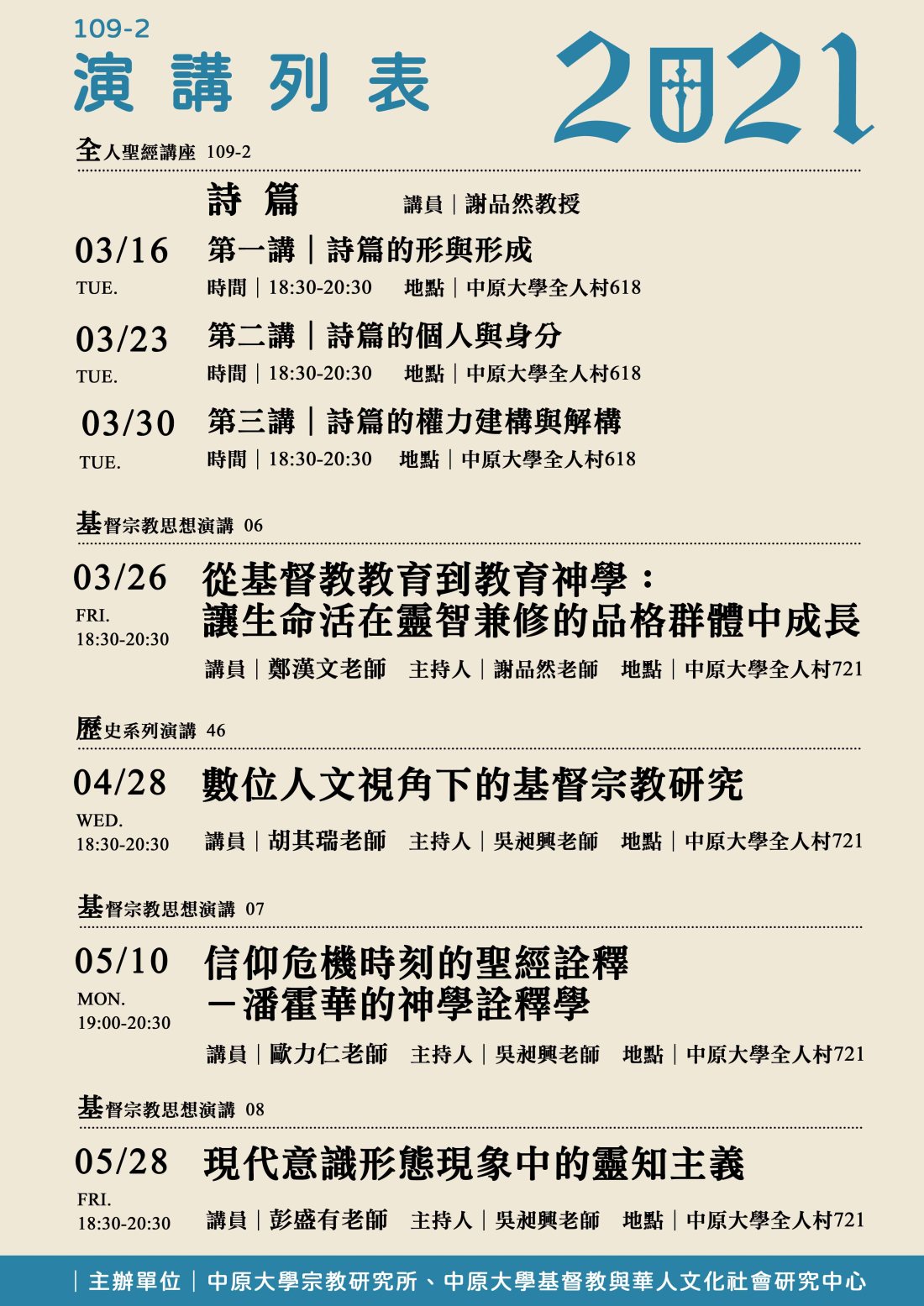 【109-2演講列表】 本學期邀請專家學者安排多場精彩演講、講座! 歡迎有興趣的同學、弟兄姊妹把時間記下來 … 繼續閱讀 【109-2演講列表】