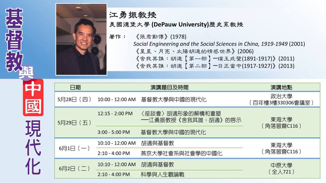 本學期最後專題演講~ 專門研究胡適的 江勇振教授跟我們談胡適眼中的基督教,也談談燕京大學社會學系,還有民初的科 … 繼續閱讀 歷史文化講座四:江永振教授「基督教與中國現代化」
