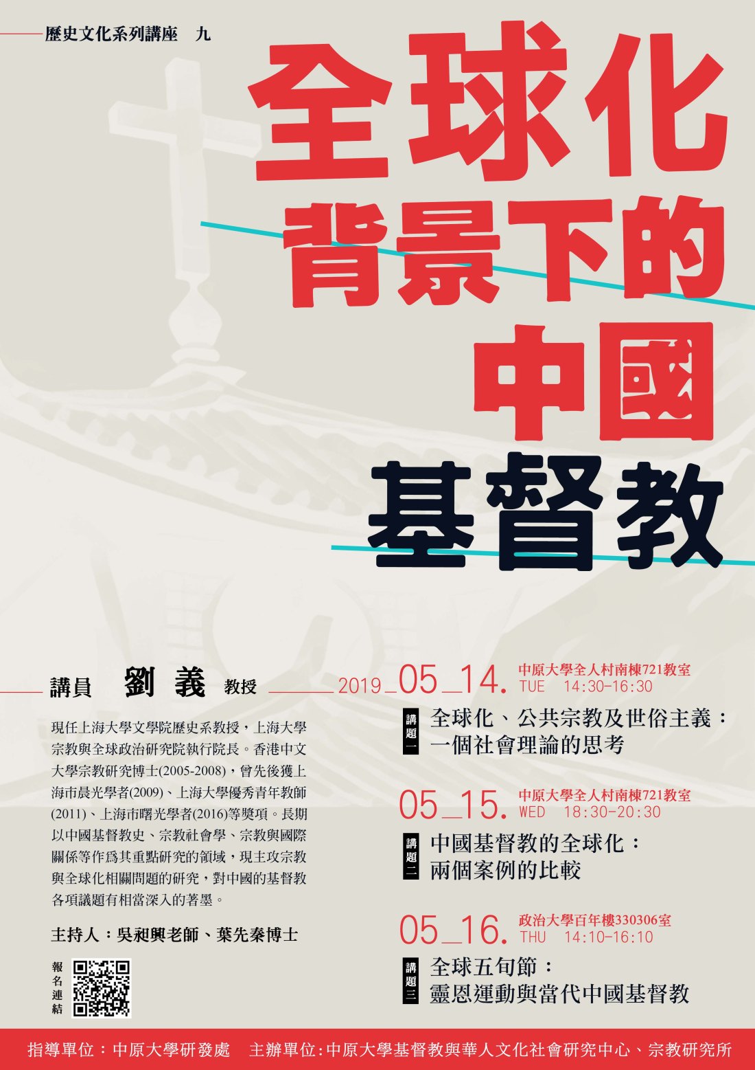 上海大學劉義教授將於5月14-16日蒞臨本中心並帶來一系列講座,歡迎大家踴躍參與! 歷史文化系列講座 九 【全 … 繼續閱讀 歷史文化講座【全球化背景下的中國基督教】