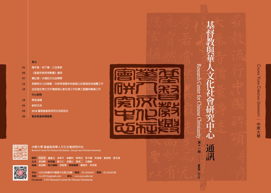 研究中心《通訊》第18期出刊囉,本期精彩內容如下,歡迎點閱! 【專 文】 ● 吳巍巍〈「福爾摩沙之鏡」:大 … 繼續閱讀 基督教與華人文化社會研究中心《通訊》第18期
