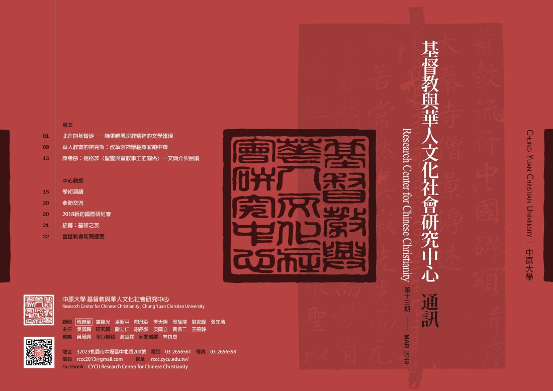 研究中心《通訊》第19期出刊囉,本期精彩內容如下,歡迎點閱! 【專 文】 ● 邢福增〈基督教的中國化與本色化〉 … 繼續閱讀 基督教與華人文化社會研究中心《通訊》第19期